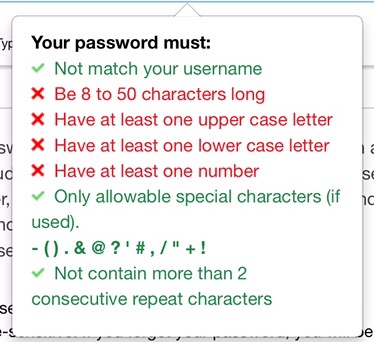 “Your password must be 8-12 digits long, include at lease 1 capital letter, 2 numeric digits, and one symbol (limited to !$&%*). Please do not use 3 repeating digits in a row…etc…etc.”